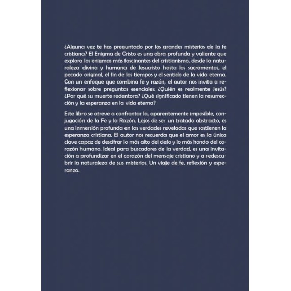 ¿Alguna vez te has preguntado por los grandes misterios de la fe cristiana? El Enigma de Cristo es una obra profunda y valiente que explora los enigmas más fascinantes del cristianismo, desde la naturaleza divina y humana de Jesucristo hasta los sacramentos, el pecado original, el fin de los tiempos y el sentido de la vida eterna. Con un enfoque que combina fe y razón, el autor nos invita a reflexionar sobre preguntas esenciales: ¿Quién es realmente Jesús? ¿Por qué su muerte redentora? ¿Qué significado tienen la resurrección y la esperanza en la vida eterna?