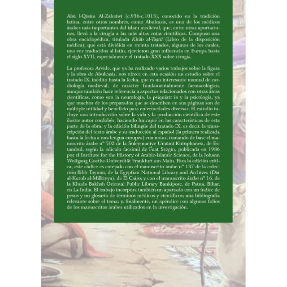 La profesora Arvide, que ya ha realizado varios trabajos sobre la figura y la obra de Abulcasis, nos ofrece en esta ocasión un estudio sobre el tratado IX, inédito hasta la fecha, que es un interesante manual de cardiología medieval, de carácter fundamentalmente farmacológico, aunque también hace referencia a aspectos relacionados con otras áreas científicas, como son la neurología, la psiquiatr ía y la psicología, ya que muchos de los preparados que se describen en sus páginas son de múltiple utilidad y beneficio para enfermedades diversas. El estudio incluye una introducción sobre la vida y la producción científica de este ilustre autor cordobés, haciendo hincapié en las características de esta parte de la obra, y la edición bilingüe del tratado IX, es decir, la transcripción del texto árabe y su traducción al español (la primera realizada hasta la fecha a una lengua europea) con notas, tomando de base el manuscrito árabe nº 502 de la Süleymaniye Um?m? Kütüphanesi, de Estambul, según la edición facsímil de Fuat Sezgin, publicada en 1986 por el Institute for the History of Arabic-Islamic Science, de la Johann Wolfgang Goethe-Universität Frankfurt am Main. Para la edición crítica, este códice es cotejado con el manuscrito árabe nº 137 de la colección ?ibb Taym?r, de la Egyptian National Library and Archives (D?r al-Kutub al-Mi?riyya), de El Cairo; y con el manuscrito árabe nº 16, de la Khuda Bakhsh Oriental Public Library Bankipore, de Patna, Bihar, en La India. El trabajo incorpora también un apartado con un índice de pesos y un glosario de términos médicos y científicos; una bibliografía relevante sobre el tema; y, finalmente, un apéndice con algunos folios de los manuscritos árabes utilizados en la investigación.