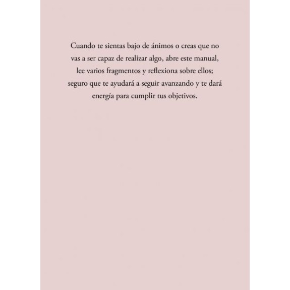 Cuando te sientas bajo de ánimos o creas que no vas a ser capaz de realizar algo, abre este manual, lee varios fragmentos y reflexiona sobre ellos; seguro que te ayudará a seguir avanzando y te dará energía para cumplir tus objetivos.