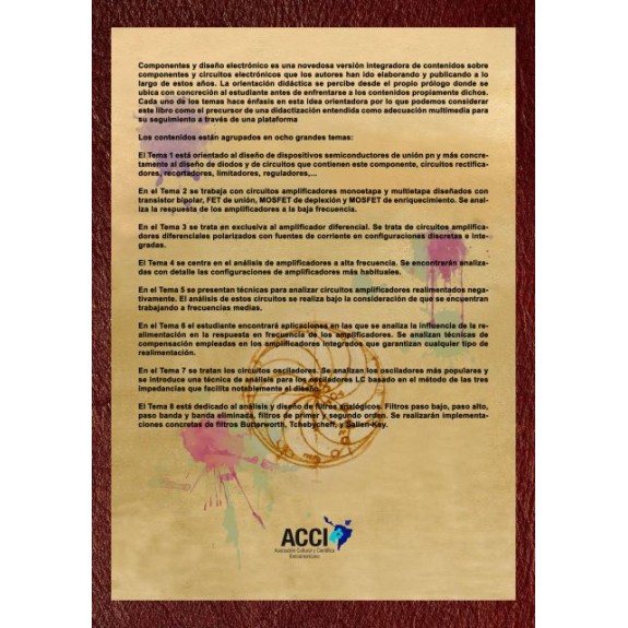 Componentes y diseño electrónico es una novedosa versión integradora de contenidos sobre componentes y circuitos electrónicos que los autores han ido elaborando y publicando a lo largo de estos años. La orientación didáctica se percibe desde el propio prólogo donde se ubica con concreción al estudiante antes de enfrentarse a los contenidos propiamente dichos.