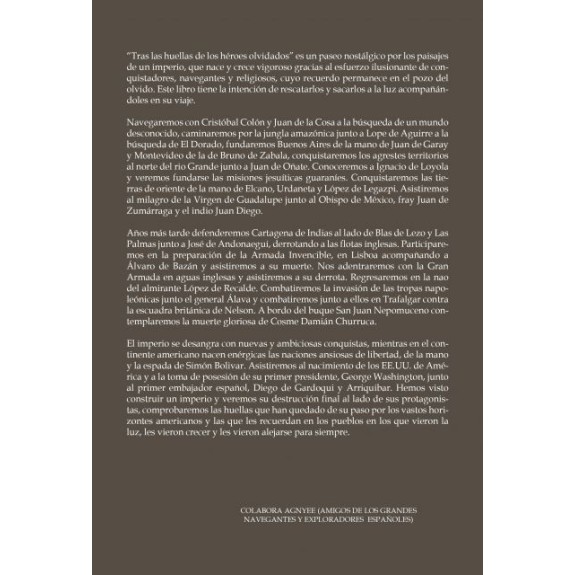 "Tras las huellas de los héroes olvidados" es un paseo nostálgico por los paisajes de un imperio, que nace y crece vigoroso gracias al esfuerzo ilusionante de conquistadores, navegantes y religiosos, cuyo recuerdo permanece en el pozo del olvido. Este libro tiene la intención de rescatarlos y sacarlos a la luz acompañándoles en su viaje.