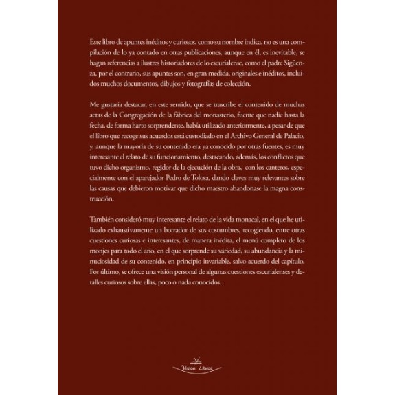 Este libro de apuntes inéditos y curiosos, como su nombre indica, no es una compilación de lo ya contado en otras publicaciones, aunque en él, es inevitable, se hagan referencias a ilustres historiadores de lo escurialense, como el padre Sigüenza, por el contrario, sus apuntes son, en gran medida, originales e inéditos, incluidos muchos documentos, dibujos y fotografías de colección.